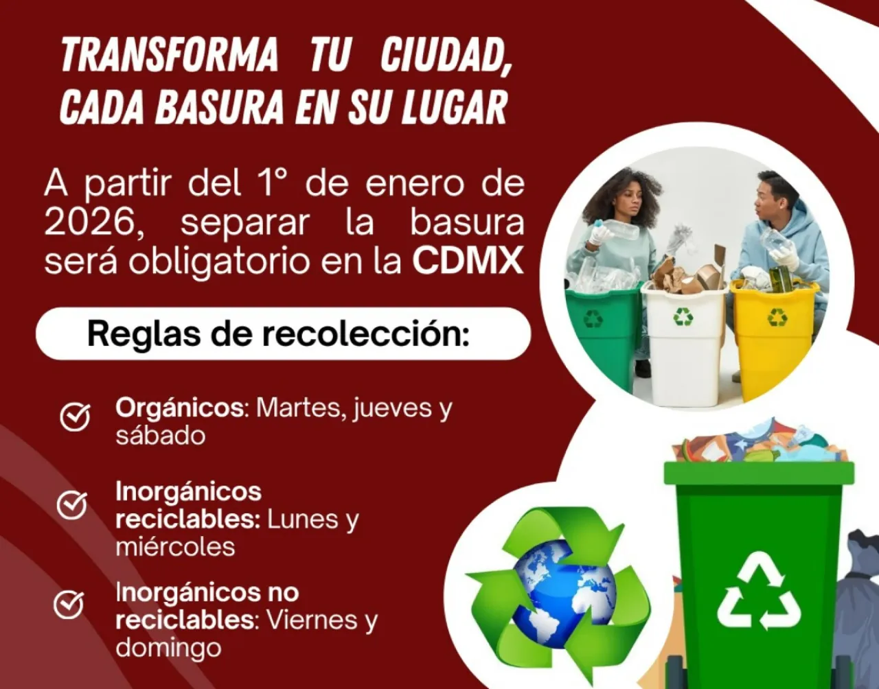 A partir de enero de 2026, separar la basura será obligatorio en toda la Ciudad de México. Con esta nueva regla, el gobierno busca reducir la contaminación y aumentar el reciclaje para lograr una ciudad más limpia y sustentable.